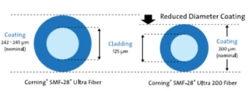 為了將更多的光纜擠進越來越小的空間,電纜制造商正在努力縮小電纜束的尺寸和直徑。例如,康寧公司(Corning)正在縮小400 Gb/s電纜的尺寸。康寧SMF-28超高200光纖電纜的特點是涂層厚度只有200微米,低于以前產品的245微米,同時保持在單模光纖中直徑125微米的玻璃包層。